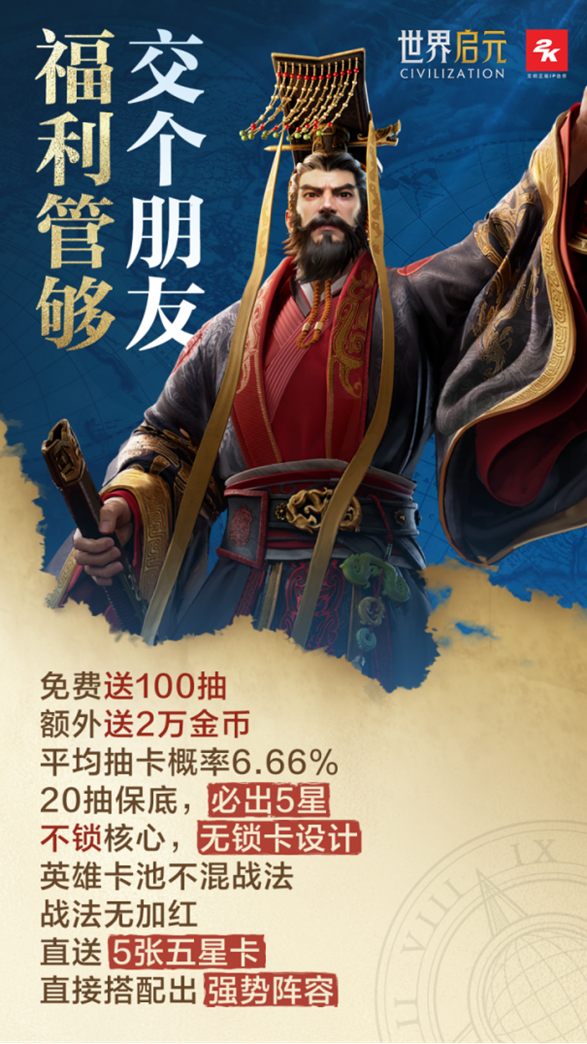 在游戏首次曝光以来,《世界启元》就一直主打与玩家交朋友。为此,他们特意喊出了“福利管够,交个朋友”的口号。免费就能领取100次抽卡机会,完成任务和参与活动还能额外免费领取2万金币。要知道,在SLG中抽卡是提升游戏实力的重要途径,《世界启元》在游戏初期就免费赠送如此海量的金币,在展现他们诚意的同时,也表明了他们乐于为玩家解压的态度。玩家用前期免费赠送的这些资源,能够平稳地渡过新手期,大幅减缓了发育压力。《世界启元》用行动表示了做好SLG没那么难。