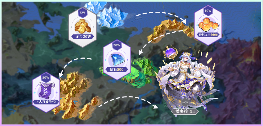 除了预约大礼包之外,我们还为天选者们准备了额外的预约里程碑礼包,预约人数达到指定数量,即可解锁指定礼包,20w金币、6666枚神识之玉、500钻石、2上古召唤券以及SSR女神潘多拉等你领取。