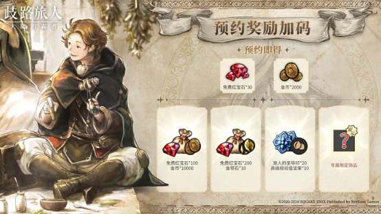 5月16日《歧路旅人:大陆的霸者》正式启程!各位旅人,我们奥鲁斯特拉不见不散!为了感谢各位旅人的陪伴和支持,所有预约奖励将在公测时全部发放,预约即得!现在预约,公测后旅人们可立得红宝石*330、旅人的圣导印*20、限定饰品以及其他养成材料, 神秘的国服限定饰品是什么呢?欢迎旅人们大胆猜测。