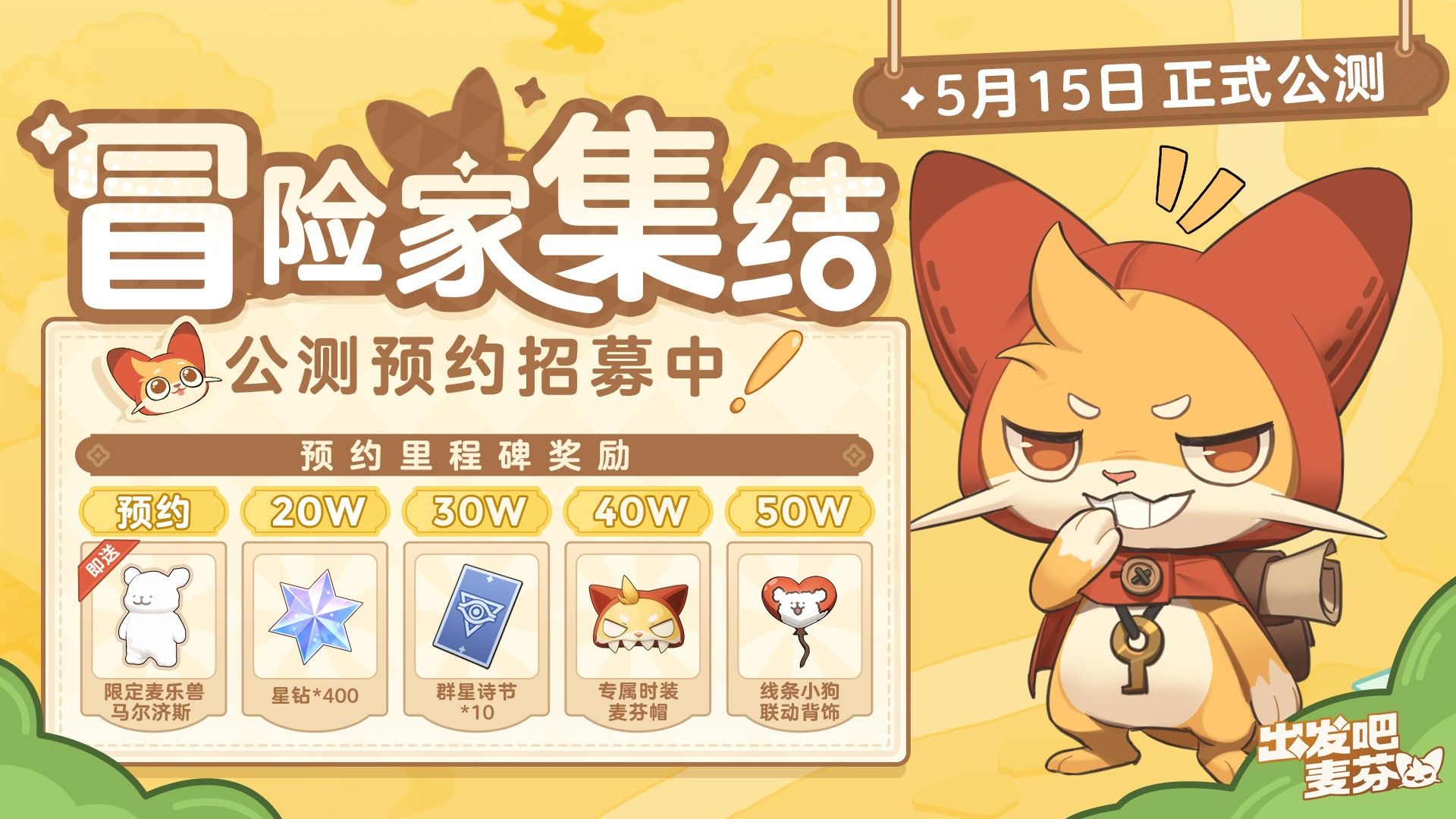 《出发吧麦芬》将于5月15日正式公测!预约就有线条小狗联动萌宠、限定饰品等好礼免费领取,还有丰富的预约里程碑奖励等你领取,还不快集结你的冒险伙伴,一起预约吧!