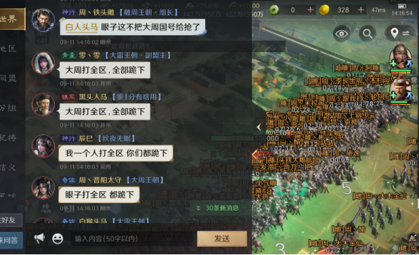 9月14日晚,战神殿也不甘落后,开关入雍州,求战之心显露无遗。而在大家不知道的角落里,乌鸡国(820)和甲天下(ZSMJ)貌似已经联合,不知在盘算着什么。