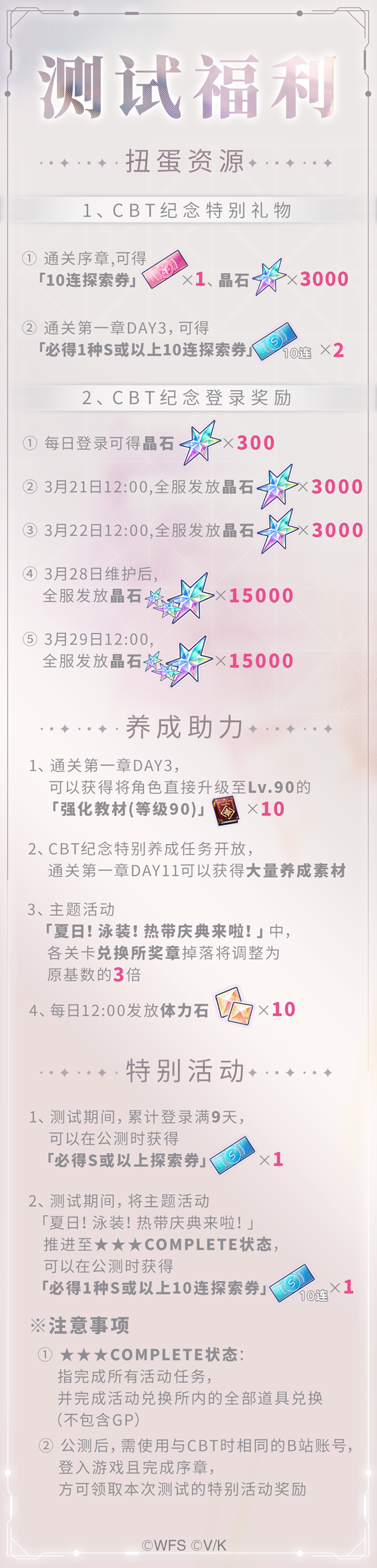 为便于玩家们体验剧情,测试中将额外开放「CBT纪念养成助力」活动,发放强化教材、养成道具及体力石等素材,同时在测试期间还将陆续发放至少可进行150连的扭蛋道具!此外,还有丰厚的充值返利活动,测试期间「在一定额度内累计获得的付费晶石」,将在游戏正式公测后全额返还到测试账号内,并加倍返还免费晶石!最后,测试期间完成指定活动任务,还可以在公测时额外获得「必得1种S或以上10连探索券」等奖励!完整测试福利内容介绍如下,可点击长图查看。