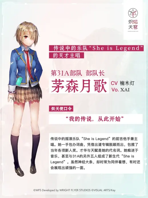 《炽焰天穹》是由Key招牌麻枝准亲自操刀制作。作为泣系游戏殿堂级元老,麻枝准已创作了《AIR》、《CLANNAD》等知名作品,而《炽焰天穹》则是其暌违15年带来的【倾注了所有热情的游戏作品】。游戏讲述了在某个地球文明濒临灭绝的未来,一群拥有特殊才能的少女投身抵抗外星生命体之战的故事,为玩家献上了一段由少女们邂逅、日常与羁绊所组成的悲喜物语。玩家将通过体验游戏内的日常线性叙事,逐步结识性格各异的同伴,在朝夕相处中共同欢笑、并肩作战,体验相遇、感受离别。在游戏内你会看到末日来临之际,主角团们在沉重使命与欢笑日常之间的情绪拉扯,体会【生死关头迸发的坚守与勇气】、【执着的守护与不懈的追寻】这些独属于人性的闪光点。