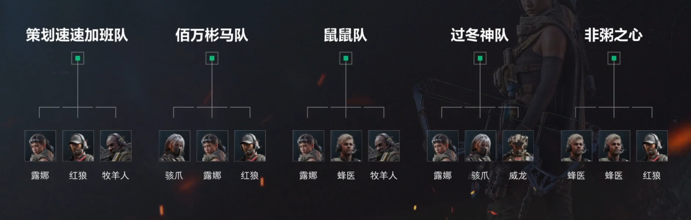首轮比赛定在零号大坝-机密行动,该场比赛要求小队之间抽签互选干员,每支小队的命运通过抽签的方式与对手紧密相连,这不仅考验每支小队对干员特性的理解,更使得各小队之间产生各种恩怨情仇。最终各小队的阵容如下。
