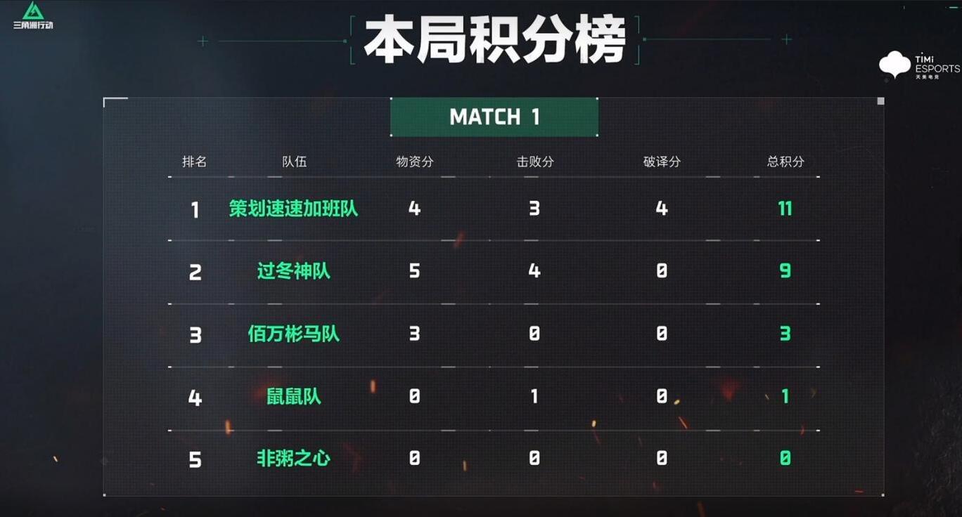 策划速速加班队击败6人,分数极高,但抢砖失败,最后只有子轩成功撤离。佰万彬马队在开局不久的近身混战中击杀非粥之心队两人,夺得先机,但随后孙某神兵天降,一穿三灭队佰万彬马,一人拯救非粥之心队。最终非粥之心队成功撤离,佰万彬马队撤离失败。过冬神队同样撤离失败。