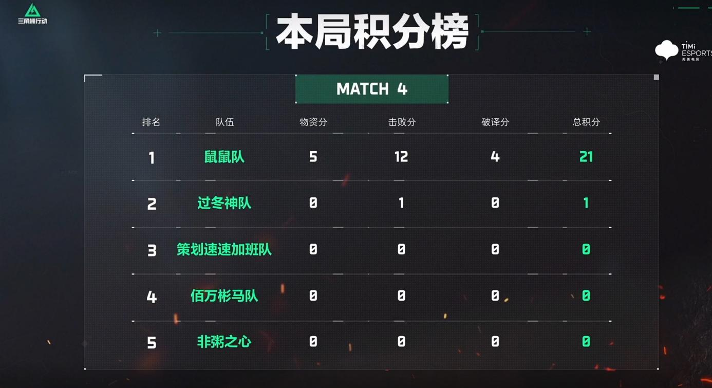 这场比赛MVP为鼠鼠队的演鑫,战神登场一己之力击败7个对手。鼠鼠队整体表现更是瞩目,总共击败干员12名,直接清图,打出四场比赛中的最高分。