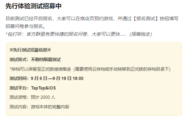 中选测试资格的玩家能体验到所有游戏本体的完整内容,并且可以在发售后免费获得一份游戏本体。在测试期间玩过的存档也可以通过TapTap云存档功能手动继承到正式版游戏中。