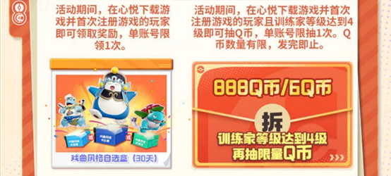 活动期间,在心悦俱乐部下载游戏并首次注册角色的玩家,角色等级达到指定等级即可领取奖励,每档奖励单账号限领1次。Q币数量有限发完即止,后续只获得游戏道具。