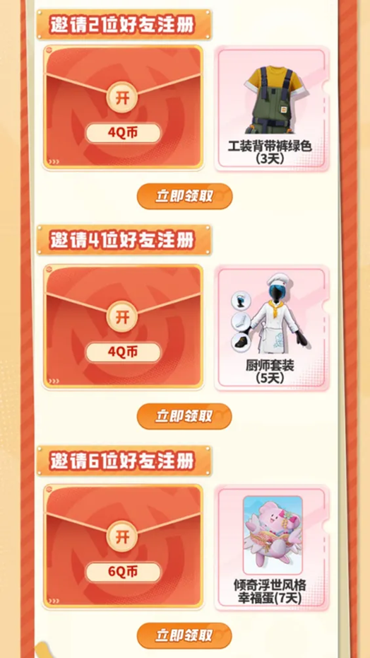 成功邀请对应数量好友在该活动下载游戏并首次注册角色即可领取对应礼包,每档奖励单账号限领1次。Q币数量有限发完即止,后续只获得游戏道具。