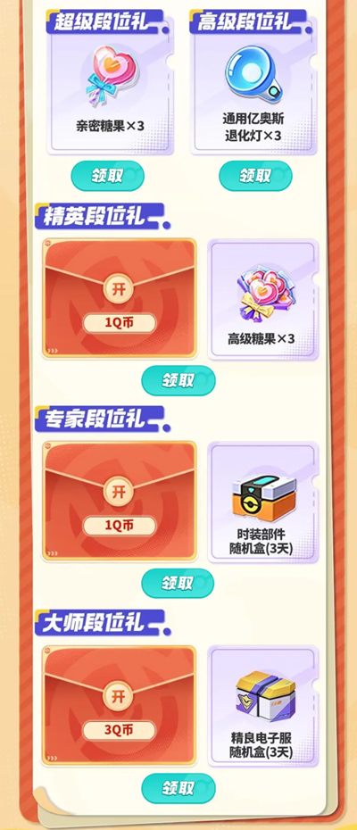 活动期间,在心悦俱乐部下载游戏并首次注册角色的玩家,段位等级达到指定等级即可领取奖励,每档奖励单账号限领1次。Q币数量有限发完即止,后续只获得游戏道具。