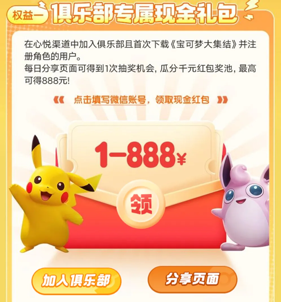 《宝可梦大集结》11月7日7:00准时开放下载!加入俱乐部且在心悦俱乐部App下载的玩家,分享页面可以获得一次抽奖机会,最高可得888元!