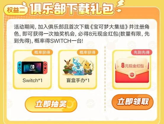 加入俱乐部的训练家们,当然还要给到其他福利啦~在心悦俱乐部下载并注册的玩家,可以领取8元红包!(数量有限,先到先得),还可以抽取Switch和盲盒手办~