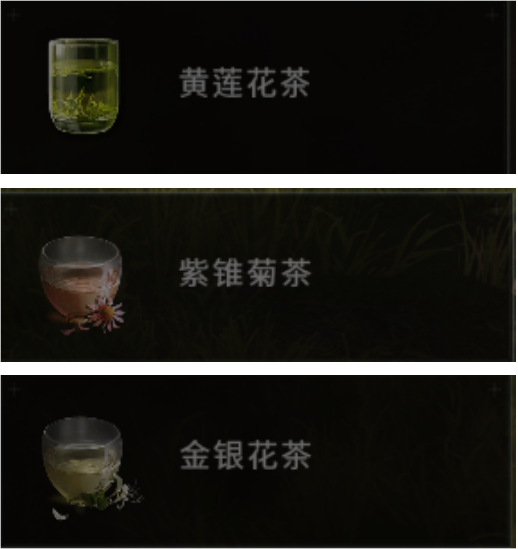 黄莲花茶:以稀有的黄莲花为主要原料,具有镇定神经和抗炎作用。喝上一杯黄莲花茶,可以帮助你舒缓伤痛,让你在剧烈战斗后更快速地恢复体力和理智值。