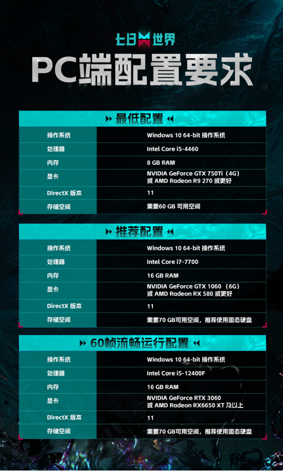 配合此次预下载和预创角活动,《七日世界》还一并公开了游戏的PC端配置要求,具体配置要求见下图,官方强烈建议玩家将游戏安装在固态硬盘中,以确保最佳游戏体验。
