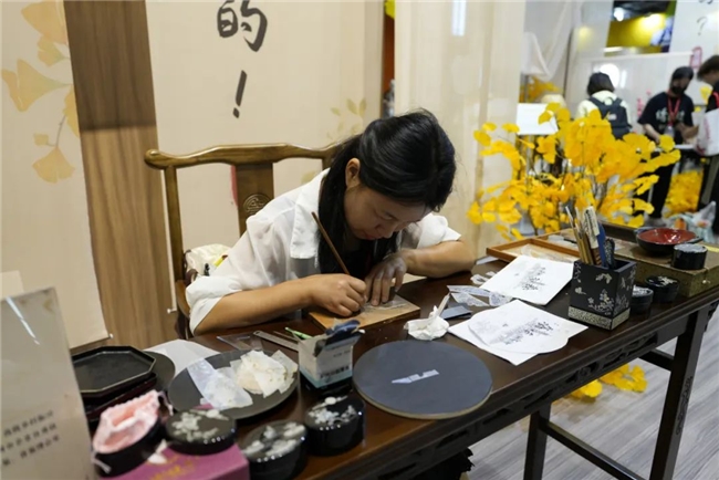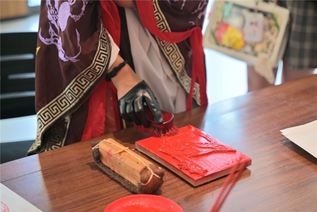 现场还设置了非遗体验区,广陵古籍刻印社受《如鸢》委托为活动刊刻了两块雕版作品,来到现场的玩家可以亲身体验雕版印刷技艺;此外,扬州漆器厂的市级非遗传承人王永霞在现场展示了螺钿技艺,向玩家讲解游戏中出现的漆器道具真实的制作技艺。