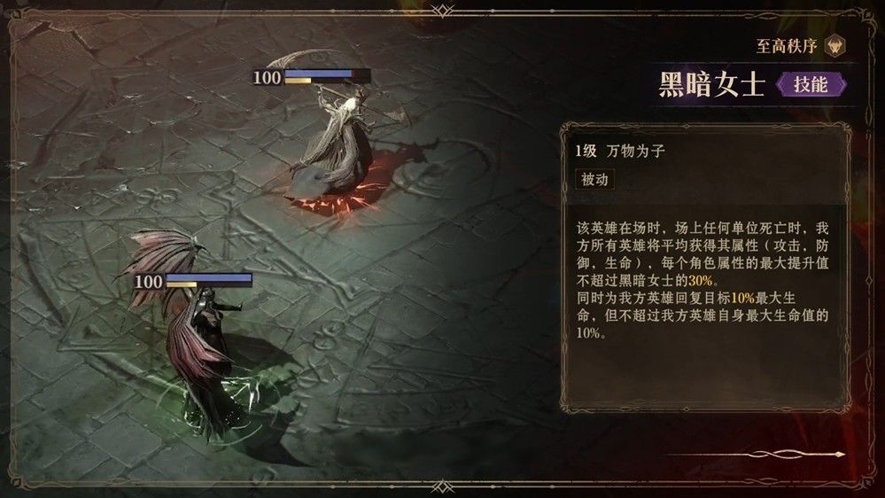 在战斗设计上,黑暗女士的完美体现了黯蚀元素的战略价值。其核心被动【万物为子】构建了一个独特的战场生态——战场每个单位的消亡都将转化为我方队伍的属性成长与状态恢复,这种强化机制使其在拉锯战中占据绝对的统治地位。而终极技能【至高统治】则展现了最纯粹的碾压,通过瞬间剥离敌方的所有增益状态,将依赖buff体系的对手打入战略真空,能彻底改写战局的走向。