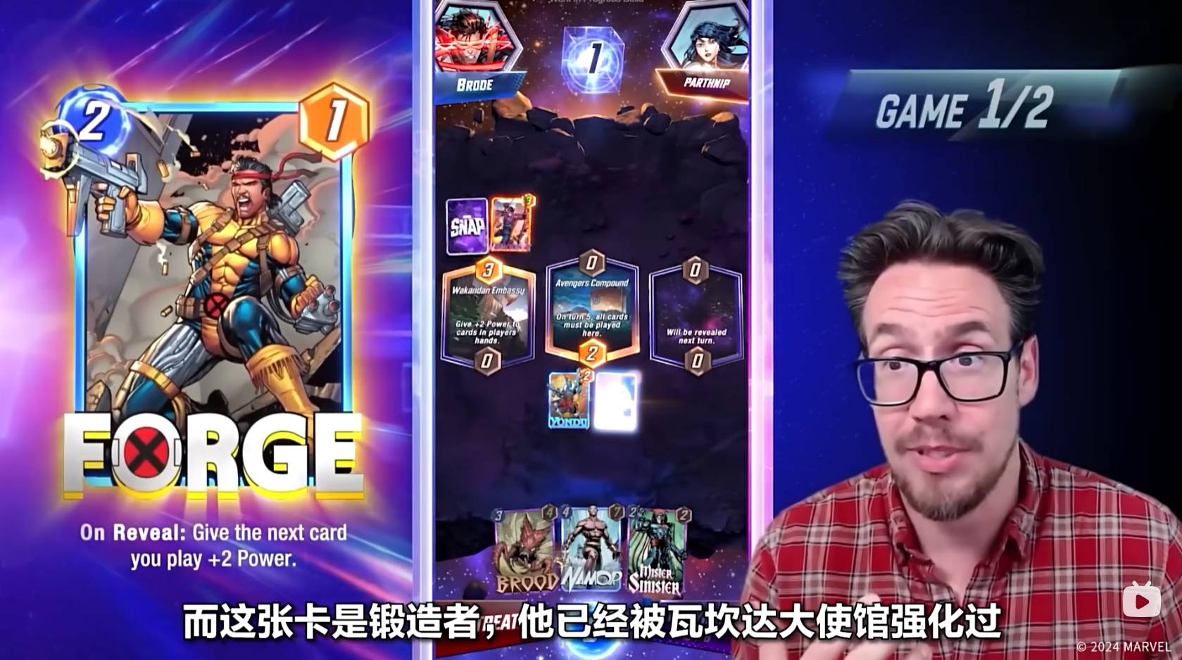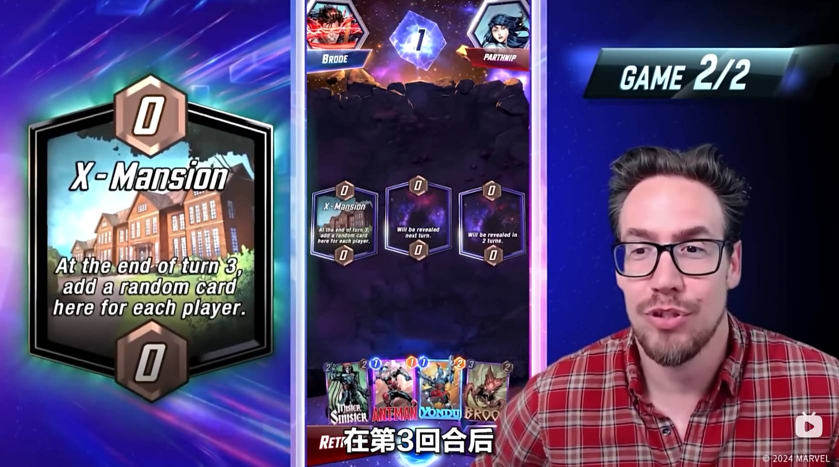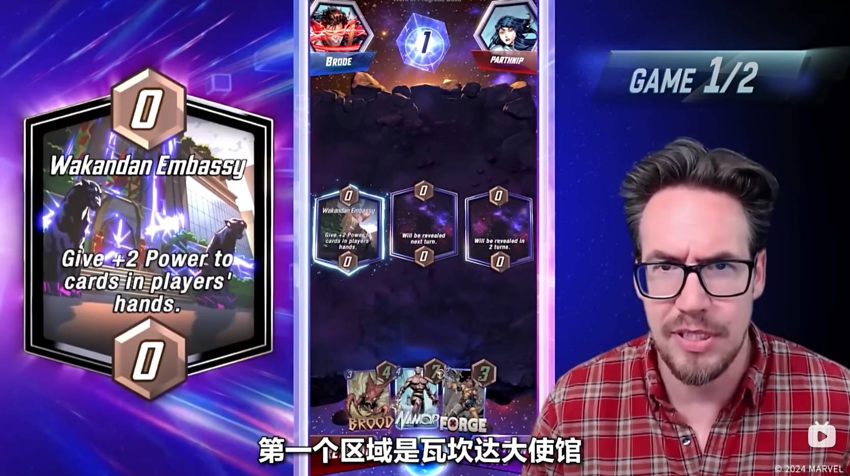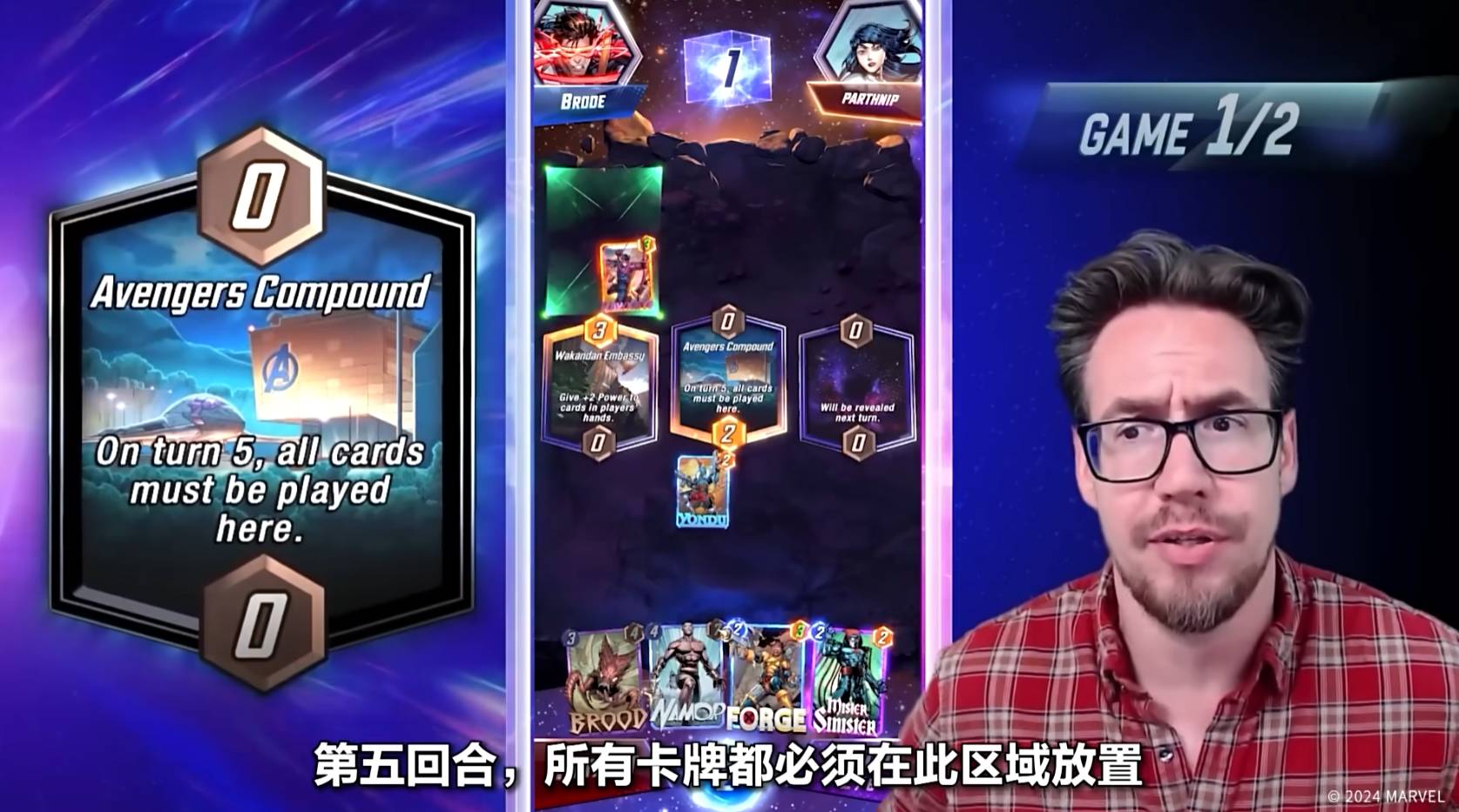而第二回合,开启的区域是复仇者基地,意味着第五个回合,双方必须把牌放置到这个区域,Ben Brode选择了使用锻造者,以此来强化自己的下一张牌。