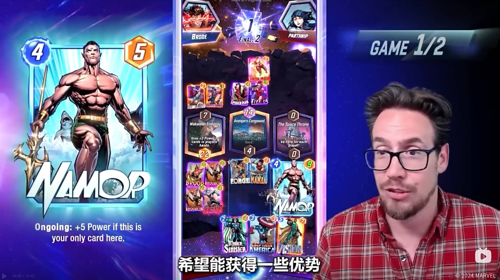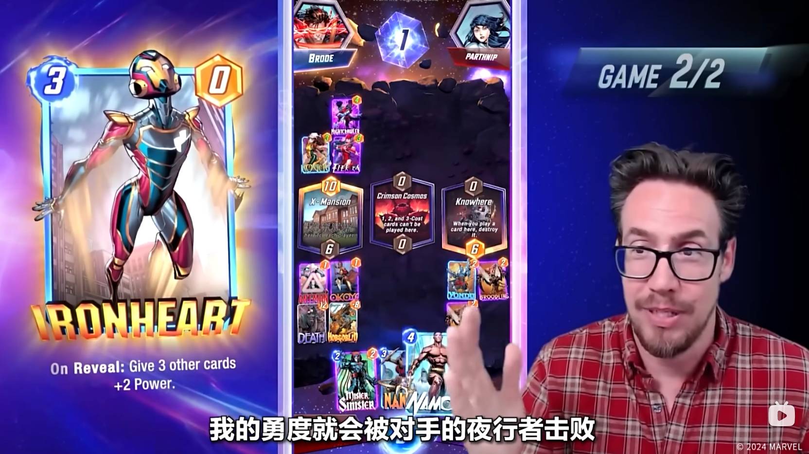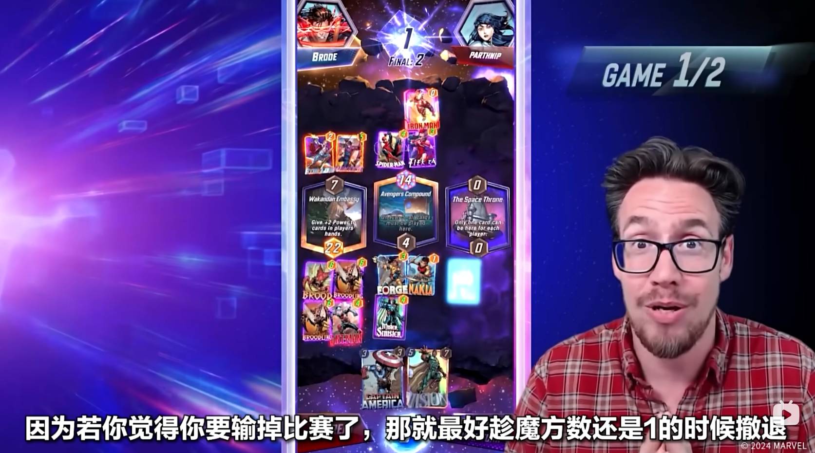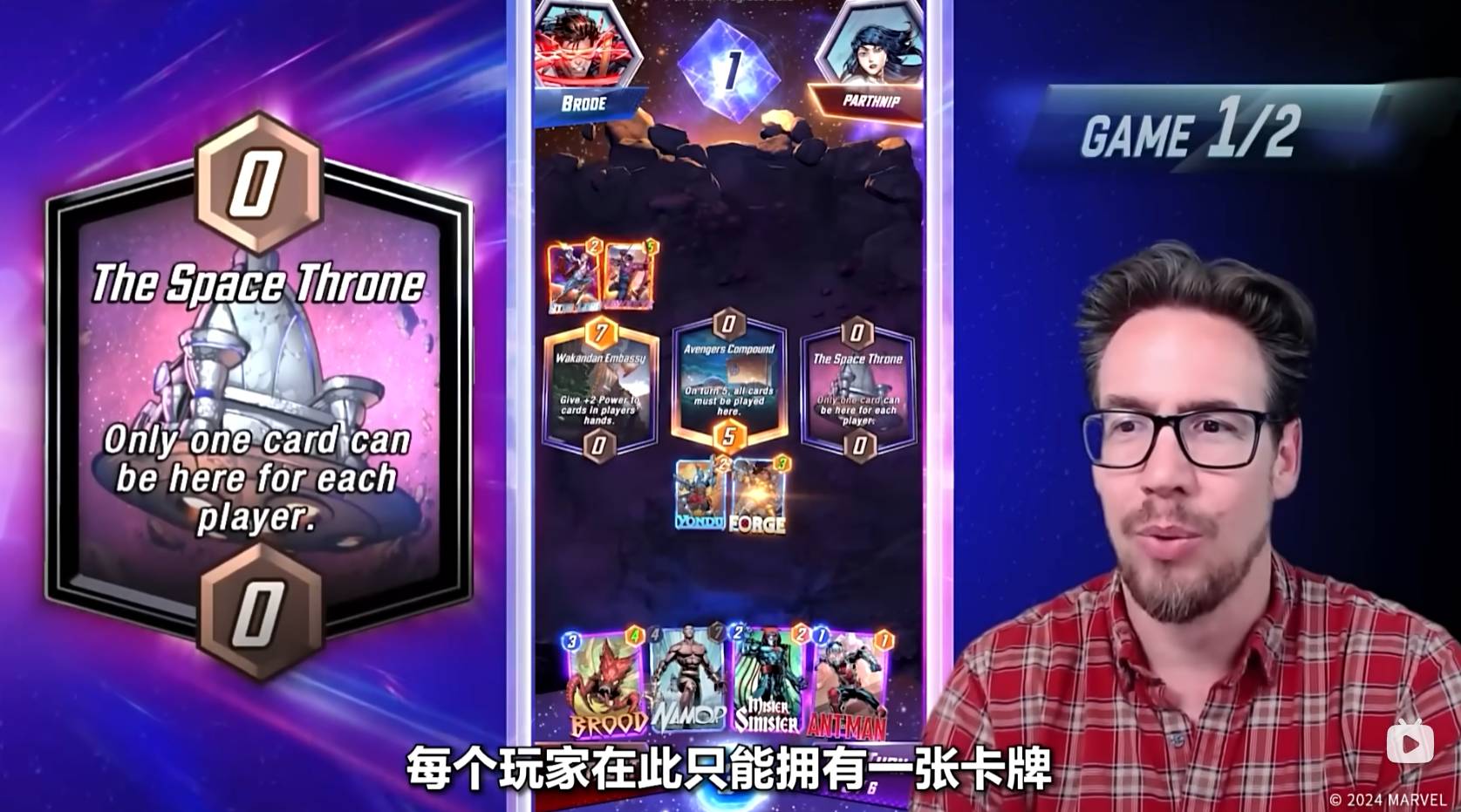 第六回合,Ben Brode只能将纳摩放置到太空王座上,纳摩在某个区域内,如果只有他一张牌,则会增加五点战力。到了狭路相逢的时刻,对手也非常可能在太空王座放置一张大战力的卡牌来取得胜利。值得一提的是,最后一回合魔方数将会翻倍,如果你觉得自己可能会失败,那就可以选择撤退。