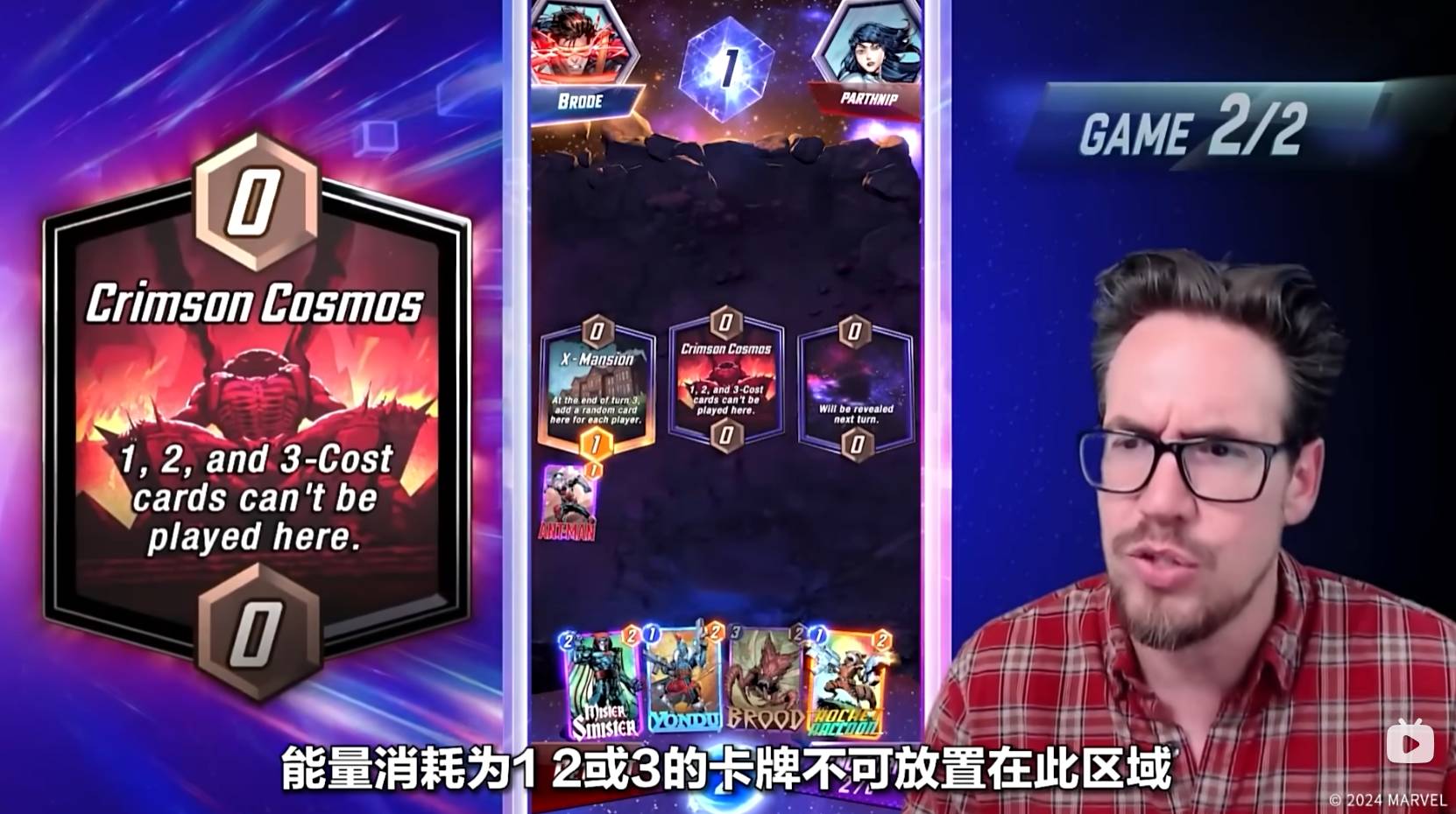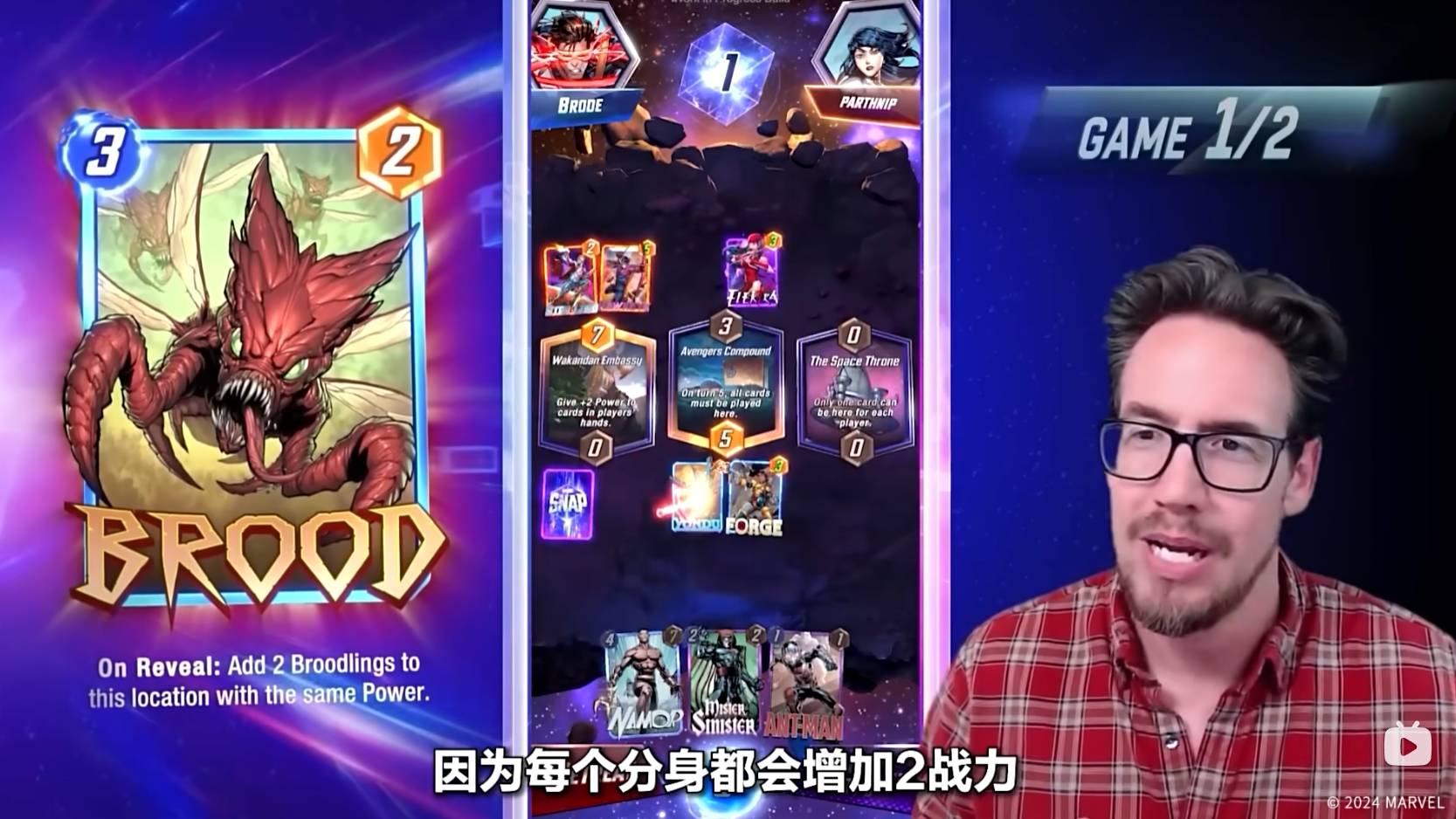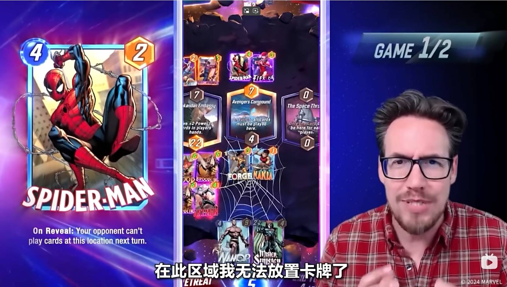 Ben Brode还在左侧的瓦坎达大使馆放置了蚁人,可以大大强化自己在这块区域的战力。但是Ben Brode也提醒大家,在放置某个区域的第四张牌时,必须要谨慎,因为这样对方就可以知晓你在这个区域的最大战力了!