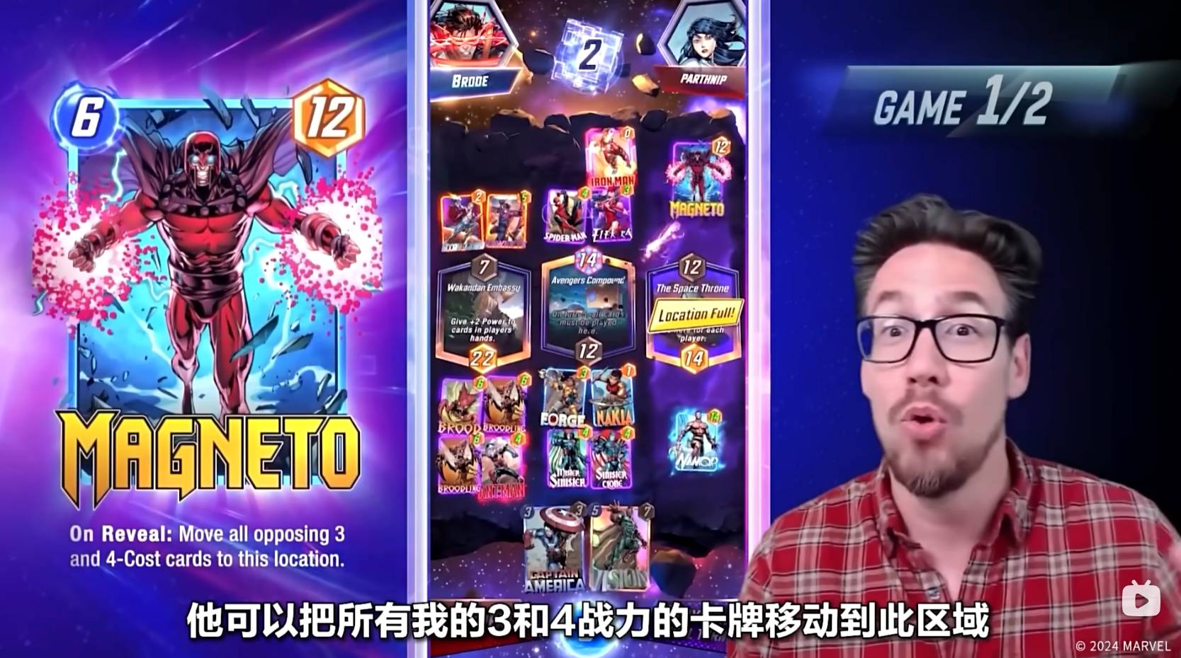 经过强化的纳摩拥有14点战力,对手放置了万磁王,可以将对方3和4战力的卡牌移动到这个区域,但是由于太空王座只能有一张卡牌,所以万磁王的效果完全没有用,12点战力的万磁王与14点战力的纳摩相比,Ben Brode取得了最后的胜利!