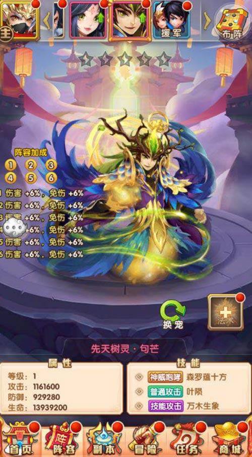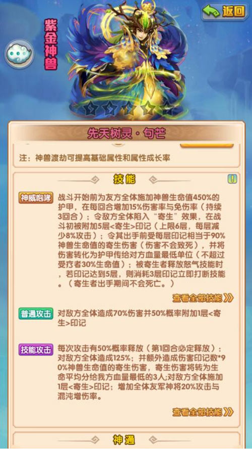 先天树灵·句芒不仅拥有强大的技能属性,它还拥有紫金神兽的两大特色养成系统——神兽化身和神兽法术。