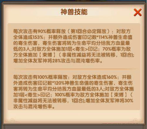 句芒每次攻击时,都有大概率可对敌方全体造成巨大伤害,还有一定几率禁锢敌方全体。同时会对敌方全体施加【寄生】效果。而根据印记数的不同,将会造成额外的伤害,同时回复我方神将血量。对敌方而言,“寄生”就如同跗骨之蛆,但却可以增加我方攻击和混沌增伤率,提升我方整体输出能力,彼竭我盈,敌方必将陷入苦战。