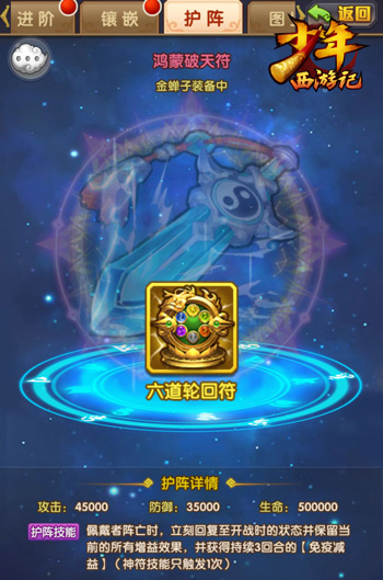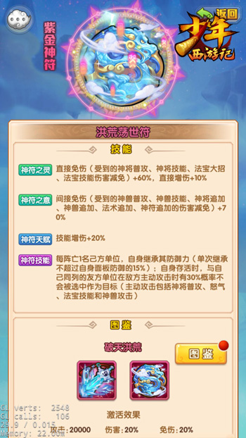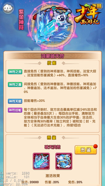 此外,鸿蒙破天符和洪荒荡世符还为玩家带来了全新的神符天赋玩法,神将佩戴紫金神符后,可提升20%的技能增伤,这显著提升了神将的输出能力。同时,紫金神符还拥有金符护阵技能,玩家可根据阵容需求,为紫金神符搭配不同的金符助阵,从而开启金符特色技能。比如,当玩家为鸿蒙破天符护阵六道轮回符之后,神将可死而复生,愈战愈勇。
