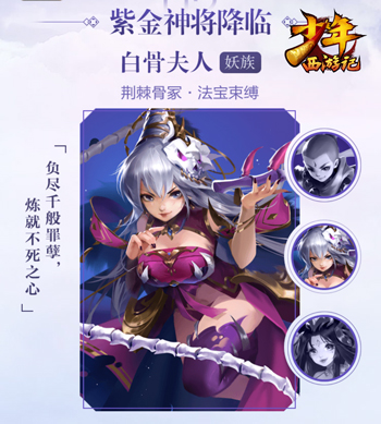 妖族的新紫金神将是白骨夫人,她原是白虎岭上一具无名尸魔,历经万劫炼就了不死不灭之躯,她的存在让方圆百里笼罩在一片阴森恐怖,她的出现甚至令同族妖怪纷纷慌恐窜逃。