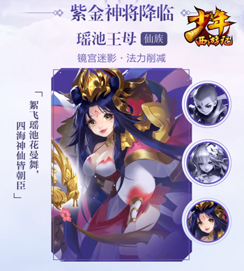 西游卡牌王者之作《少年西游记》全新资料片“宿命轮回”将于12月10日正式上线。紫金神将金蝉子、瑶池王母和白骨夫人世界观、原画今日首次曝光。此外,紫金宝物也将在新资料片中登场,并带来特色“淬炼”技能。同时,四重福利狂欢活动即将开启,玩家参与即可获得海量元宝和紫金神将养成资源!