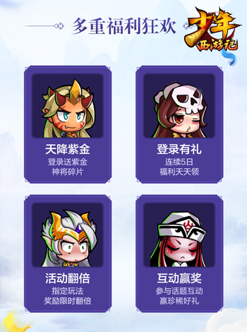 此外,《少年西游记》还将于12月10日新资料片上线后,同步开启天降紫金、登录有礼、活动翻倍、互动赢奖四重狂欢福利,玩家参与即可获得紫金神将碎片、紫金宝物养成资源、紫金法宝碎片、海量元宝等珍稀奖励。关于更多精彩内容,请关注官方的后续资讯。