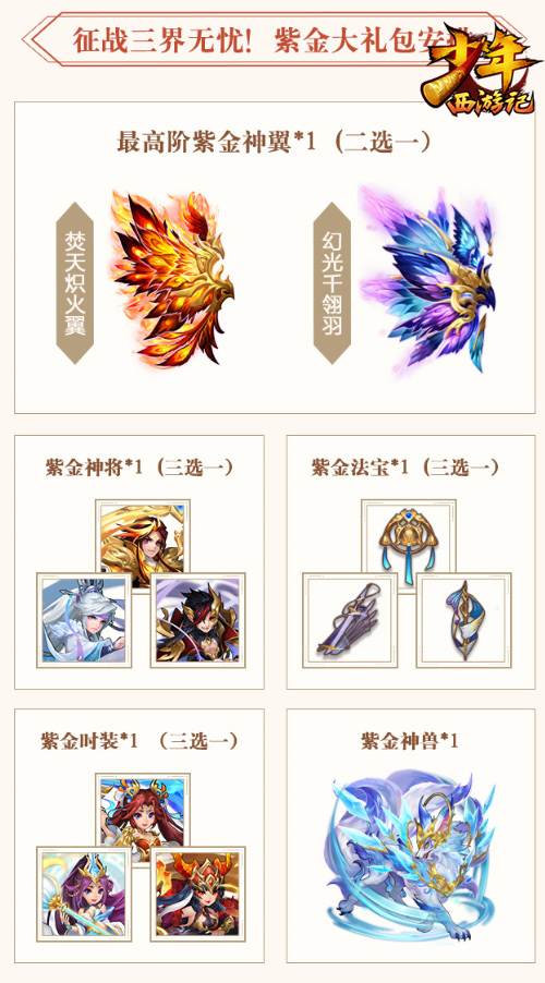 在本次“召唤!西游锦鲤活动”的奖池中,备受关注的莫过于“紫金道具大礼包”了,该礼包中包含了紫金神翼、紫金神将、紫金法宝、紫金时装以及最新的紫金神兽“幽影魔魇·九尾”,获奖的小“锦鲤”可根据自己的阵容需求,任意搭配出游戏内目前最顶级的阵容组合。