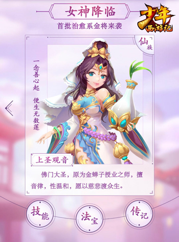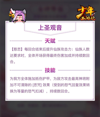 作为仙族金将,上圣观音能为阵容中的仙族提供大量攻击力与伤害加成。同时,她还可为敌方神将附加“悲咒”效果,从而达到牵制敌方怒气恢复的目的。