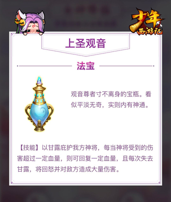 除了天赋和技能,上圣观音还拥有法宝大招,该大招可为我方阵容中的神将提供甘露庇护,不仅可恢复血量,甘露庇护被打破时还可对敌方全体神将造成海量伤害。