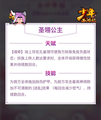 圣翎公主是妖族治愈系金将,她可在对决时为阵容中的妖族神将免疫负面状态,并且与指定数量的妖族神将同时上阵,还可开启额外的增伤效果。同时,圣翎公主拥有强力的天赋和技能,不仅能我方创造一个抵伤护盾,还可限制敌方神将的怒气恢复。