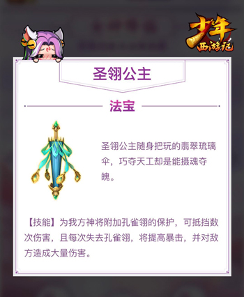 此外,圣翎公主的法宝大招可为我方神将提供孔雀翎的保护,从而抵挡数次伤害,且每次失去孔雀翎,我方神将都将提高暴击,并对敌方全体神将造成大量伤害。