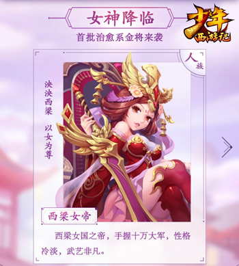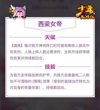 人族治愈系金色神将是西梁女帝,当她上阵后可开启“魂殇”属性,每当我方有神将阵亡时,人族神将都将获得命中与免伤加成。同时,西梁女帝还可为我方全体神将附加抵伤护甲,并使敌方血量最低的两名神将附加“情殇”状态,处于该状态的神将血量回复时转化为等量伤害。