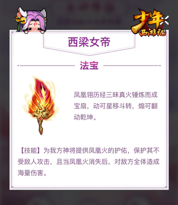 而西凉女帝的法宝技能更是可为我方全体神将附加“凤凰火”,不仅可使我方神将免受攻击,当凤凰火消失后敌方全体神将还将受到海量伤害。