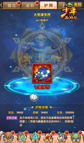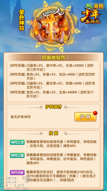 同时,两款神符在对决中还可发挥强力的控制能力。每当佩戴“阿鼻地狱符”的神将攻击时,它可概率降低敌方前排神将的攻击,同时,并为其附加“贪障”状态,处于该状态的神将无法获得除了生命之外的增益属性,此消彼长,从而使我方更容易占据主动。