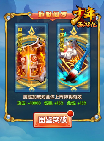 与“阿鼻地狱符”一同登场的为“十字阎罗符”,当佩戴该符的神将生命首次低于一定值或阵亡时,它可使敌方低于自身攻击力1.5倍的神将减少2点怒气,并极大降低其造成的伤害,从而保证了我方神将的续航与输出。