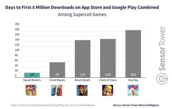 在大框架上,《爆裂小队》以融合式的玩法糅合在海外取得了巨大成功。游戏海外上线仅用时20天预约量便超过3000万,上线首周下载量超3000万,且《爆裂小队》是Supercell旗下最快达成500万次下载的产品,饱受玩家的喜爱。