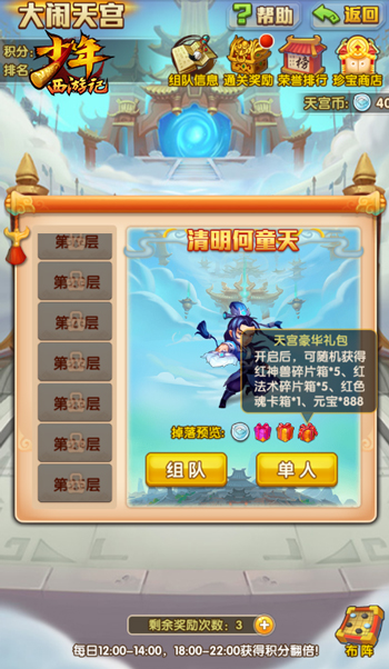 在新资料片中,集策略和跨服社交为一体的特色PVE玩法“大闹天宫”首度登场。“大闹天宫”玩法由单人模式和跨服组队模式组成,玩家可通过跨服组队友、制定上阵策略进行通关。通关过程中,玩家可获得海量元宝、天宫币、红仙灵等珍稀道具。