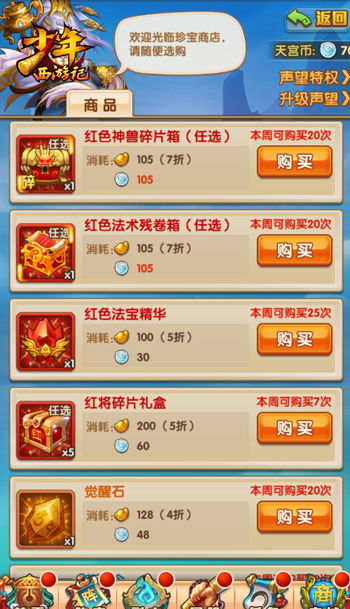 与此同时,珍稀道具商店“珍宝阁”同步开启,在该商店中,玩家可使用通关“大闹天宫”的过程中获得的天宫币,以高折扣购买红色神兽、红色法术书等珍稀资源,其福利力度可谓前所未有。