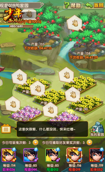 《少年西游记》融合模拟经营元素独创的“家园系统”,此前深受玩家喜爱。本次,家园系统再度升级,全新园艺玩法上线——玩家可在家园中种植天山雪莲、向日葵,通过浇灌、采集等方式,获得相应作物,用来换取红将碎片、蟠桃等资源。此外,玩家还可拜访好友,从好友的农田中“拿”取一定作物资源哦!