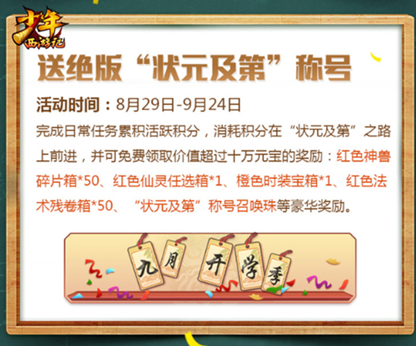 本次新资料片上线恰逢9月开学季,《少年西游记》将在8月29日-9月24日期间开启福利狂欢月活动,玩家参与即可领取绝版“状元”称号、海量元宝红包、红色仙灵等珍稀资源奖励,更多精彩内容,请关注官方的公告。