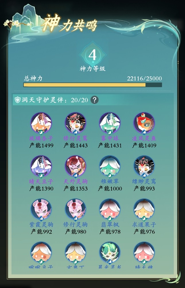 产能前20只灵伴会自动成为洞天的守护灵,神力为守护灵的产能总和,一部分用以维护洞天的稳定,另一部分神力将转化为神力祝福,使洞天主人获得属性提升。