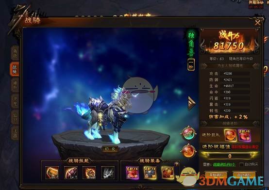一、完成主线任务开通战骑功能的时候,可以免费获得第一批战骑:“独角兽”,按快捷键“D”就可骑乘。