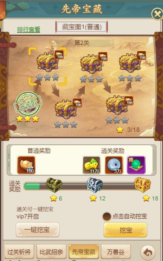 接着就是先帝宝藏,这个呢就是一个通关类型的玩法,但是不同的就是设有星数,三星是最高的,而且奖励也是存在经验,关数越高,奖励越高,经验也是越多的,而且星数达到一个层次也是会有奖励的。