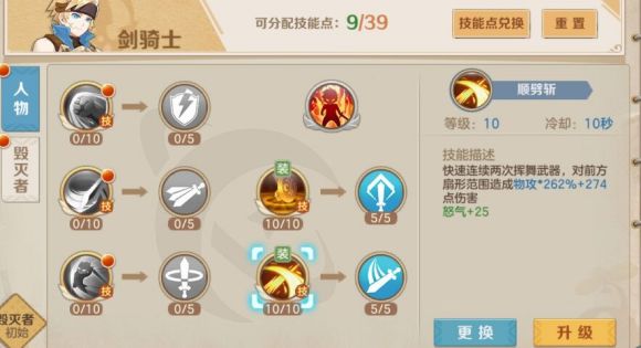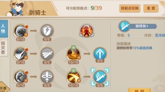 前期就是把技能都点满,先点出5级的技能,大部分的技能都是必备的。剑士是有两个转职路线的,一个就是守护者,一个就是毁灭者,两个不同的输出路线,专属的技能进行搭配,解锁各种职业的技能和搭配。
