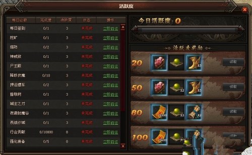 只要玩家每天登陆游戏,完成指定的活跃任务,即可获得一定的活跃度分值,当活跃度达到指定的分值,即可领取相应丰厚的活跃奖励。
