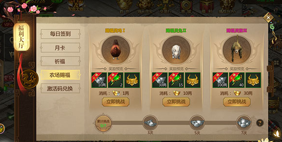 赐福灵鸡I、赐福灵兔II、赐福灵猴III,获得的奖励都是有着绑银、升星石、地元装备的获得。当然肯定是越高难度的奖励越加丰厚了,同时玩家在累计挑战3次、5次、7次可以获得更多的绑银奖励。